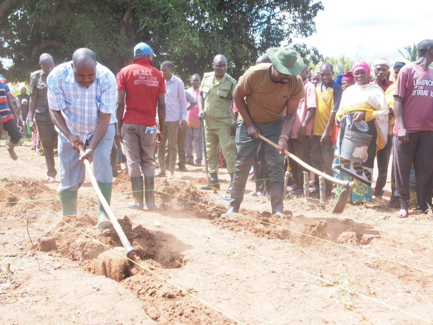 Mkuu wa wilaya ya Tunduru Julius Mtatiro kulia na Mkurugenzi Mtendaji wa Halmashauri ya Tunduru Chiza Marando kushoto,wakishiriki kuchimba msingi kwa ajili ya ujenzi wa miundombinu ya elimu katika shule ya msingi Ligoma wilayani humo.