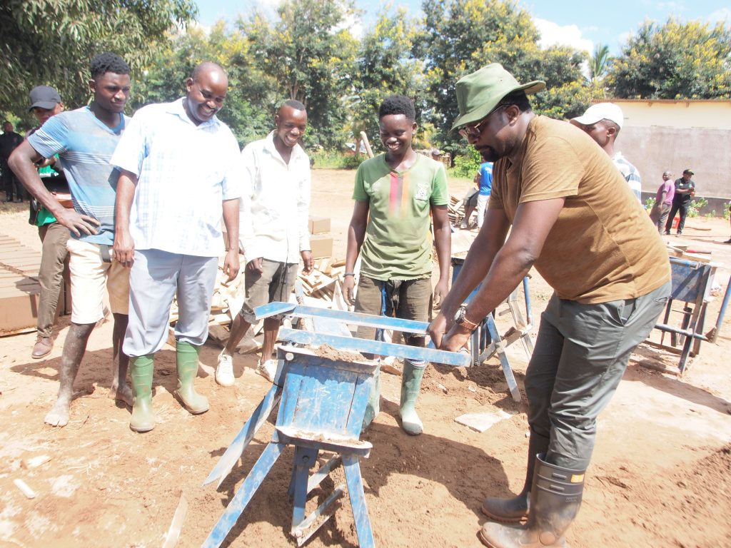 Mkuu wa wilaya ya Tunduru mkoani Ruvuma Julius Mtatiro akizundua kazi ya kufyatua tofali kwa ajili ya ujenzi wa miundombinu ya elimu ya awali na msingi katika shule ya msingi Ligoma.
