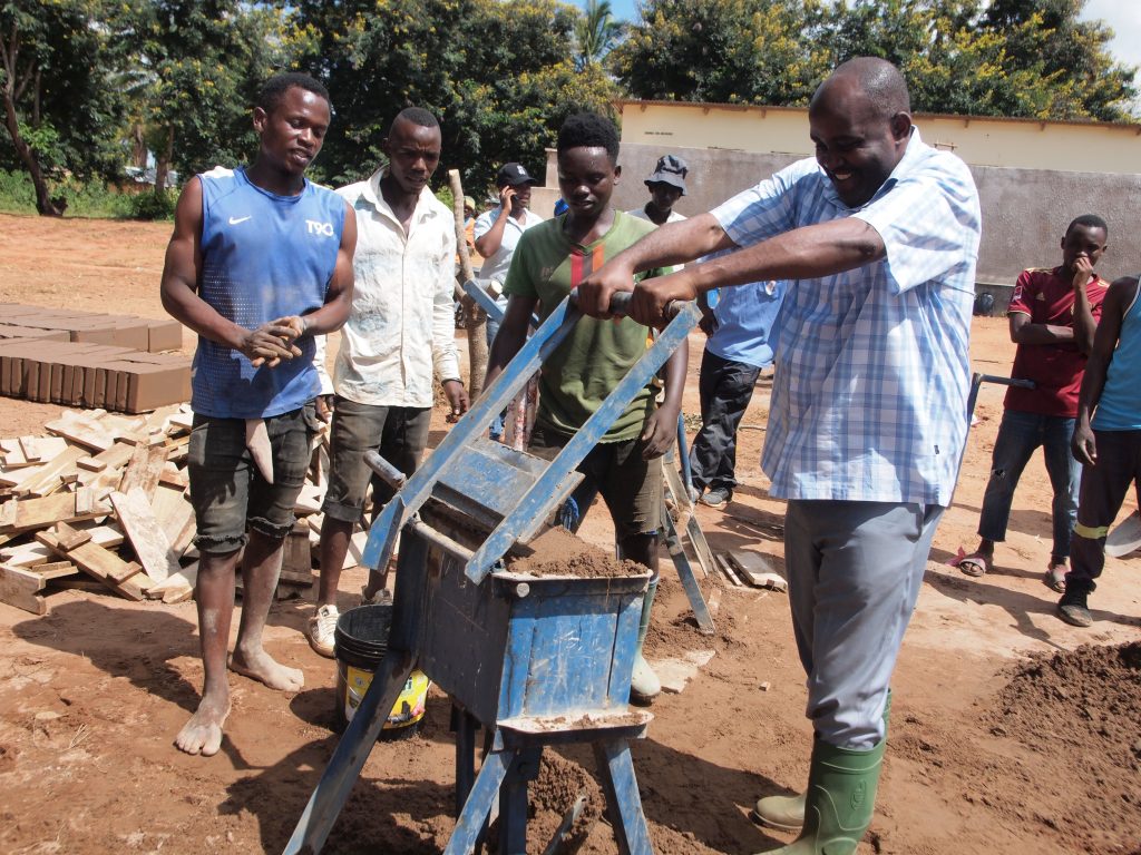 Mkurugenzi Mtendaji wa Halmashauri ya wilaya Tunduru mkoani Ruvuma Chiza Marando akifyatua tofali kwa ajili ya kujenga vyumba vya madarasa katika shule ya msingi Ligoma wilayani humo.