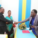 Mkurugenzi wa Usimamizi wa Rasilimali watu na Utawala wa Mabasi Yaendayo Haraka (DART) Dkt. Elephas Mollel mara baada ya kukabidhi zawadi na vifaa mbalimbali kutoka DART kwa Sister Efrancia Julius na Sister Mari Rosalia Gargulo wa kijiji cha Matumaini kilichopo Kisasa jijini Dodoma katikati ni Father Vicent Boselli Mei 19,2023