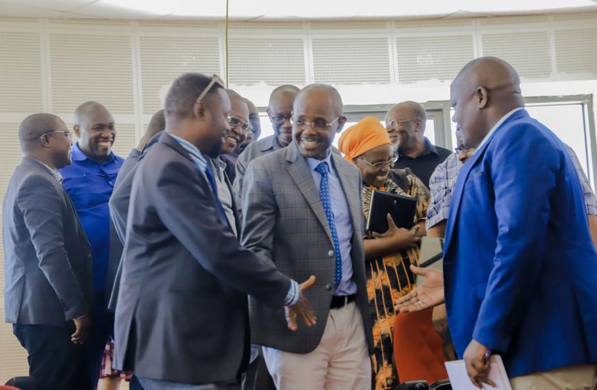 Waziri wa Ujenzi na Uchukuzi Profesa Makame Mbarawa (katikati) akisalimiana na Mameneja wa Wakala wa Barabara Tanzania (TANROADS), mara baada ya kumaliza kikao kazi kilichowakutanisha Mameneja hao na Waziri huyo jijini Dodoma.