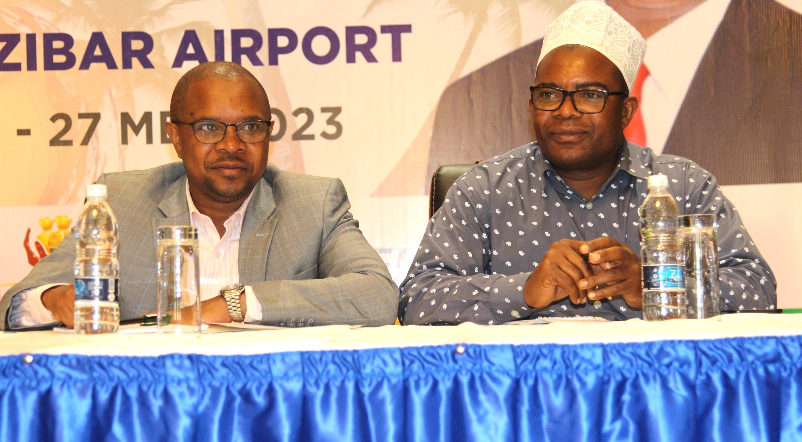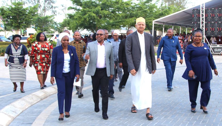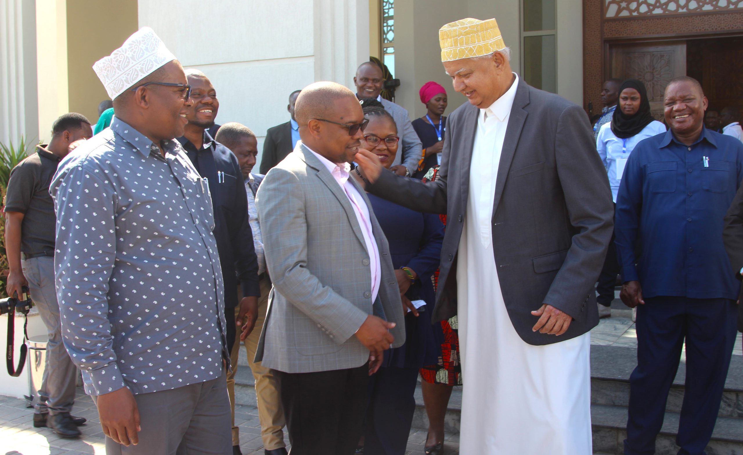 Waziri wa Nchi, Afisi ya Rais, Katiba, Sheria, Utumishi na Utawala Bora Zanzibar, Mhe. Haroun Ali Suleiman na Naibu Waziri, Ofisi ya Rais, Menejimenti ya Utumishi wa Umma na Utawala Bora, Mhe. Ridhiwani Kikwete wakiwasili kuzungumza na Watunza Kumbukumbu na Nyaraka wakati wa mafunzo maalumu kuhusu Nidhamu, Uadilifu na Utunzaji Siri sehemu za kazi yanayoendelea katika Ukumbi wa Golden Tulip-Zanzibar.