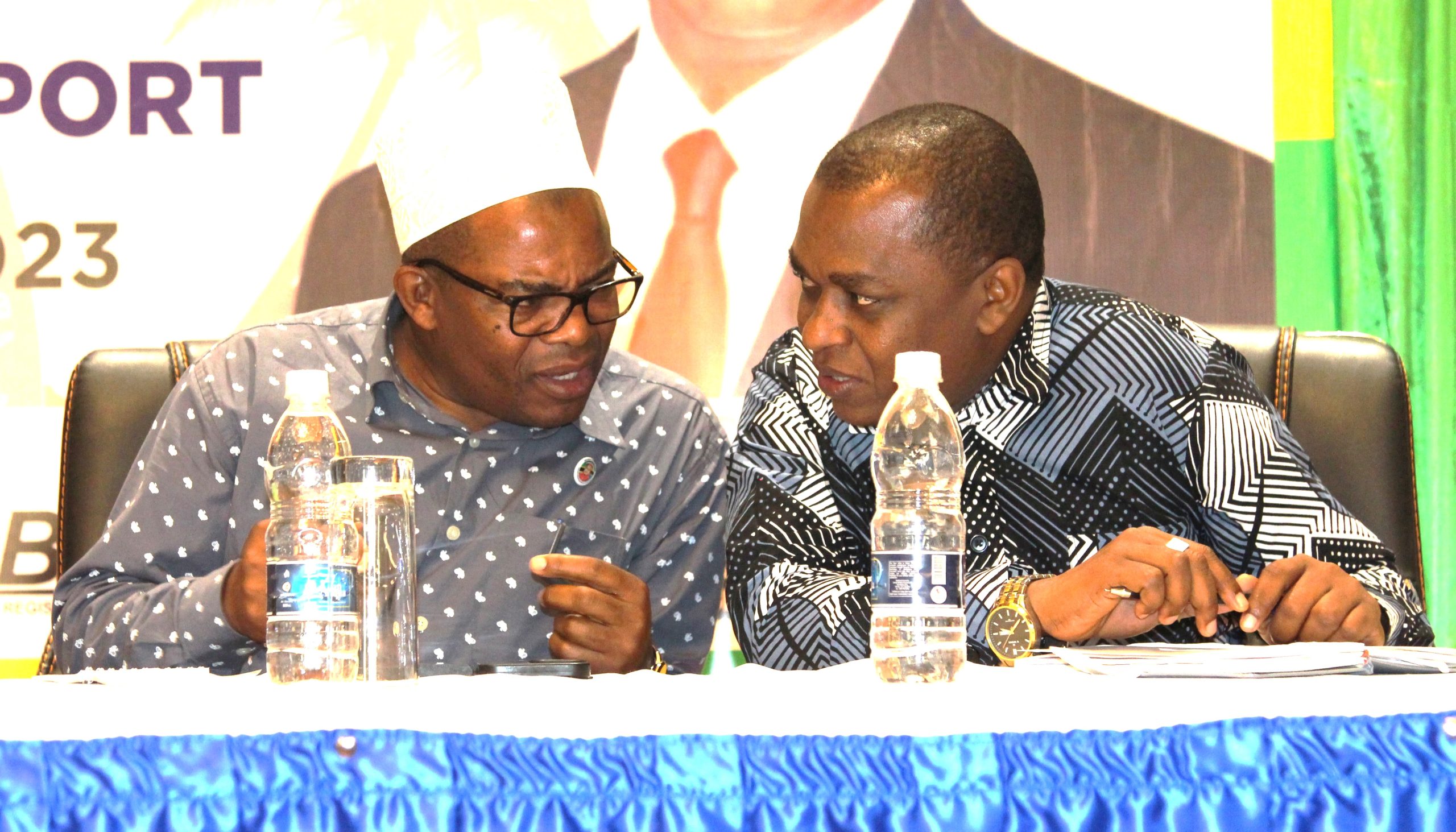 Katibu Mkuu, Ofisi ya Rais, Menejimenti ya Utumishi wa Umma, Bw. Juma Mkomi akiteta jambo na Naibu Katibu Mkuu Afisi ya Rais, Katiba, Sheria, Utumishi na Utawala Bora Zanzibar, Bw. Omar Gora wakati wa mafunzo maalumu kuhusu Nidhamu, Uadilifu na Utunzaji Siri sehemu za kazi yanayoendelea katika Ukumbi wa Golden Tulip-Zanzibar.