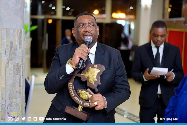 | Balozi wa Tanzania nchini Jamhuri ya Kidemokrasia ya Congo (DRC), Mhe Said J Mshana akiongea jambo baada ya kukabidhiwa Tuzo na Serikali ya DRC |