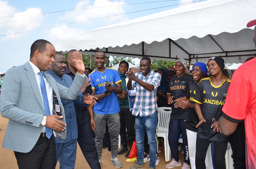 Waziri wa Nchi (AR) Tawala za Mikoa Serikali za Mitaaa na Idara maalum za SMZ Masoud Ali Mohammed akisalimiana na kufurahi pamoja na Vijana wa kikosi cha Jeshi la kujenga Uchumi (JKU) wakati wa hafla ya uchangiaji damu iliyofanyika uwanja wa magirisi ikiwa ni maadhimisho ya siku ya uchangiaji Damu duniani ambayo Kitaifa huadhimishwa kila ifikapo juni 14,hafla iliyofanyika juni 15,2023 huko uwanja wa Magirisi Wilaya ya Magharib B Mkoa wa Mjini Magharibi juni 15,2023.