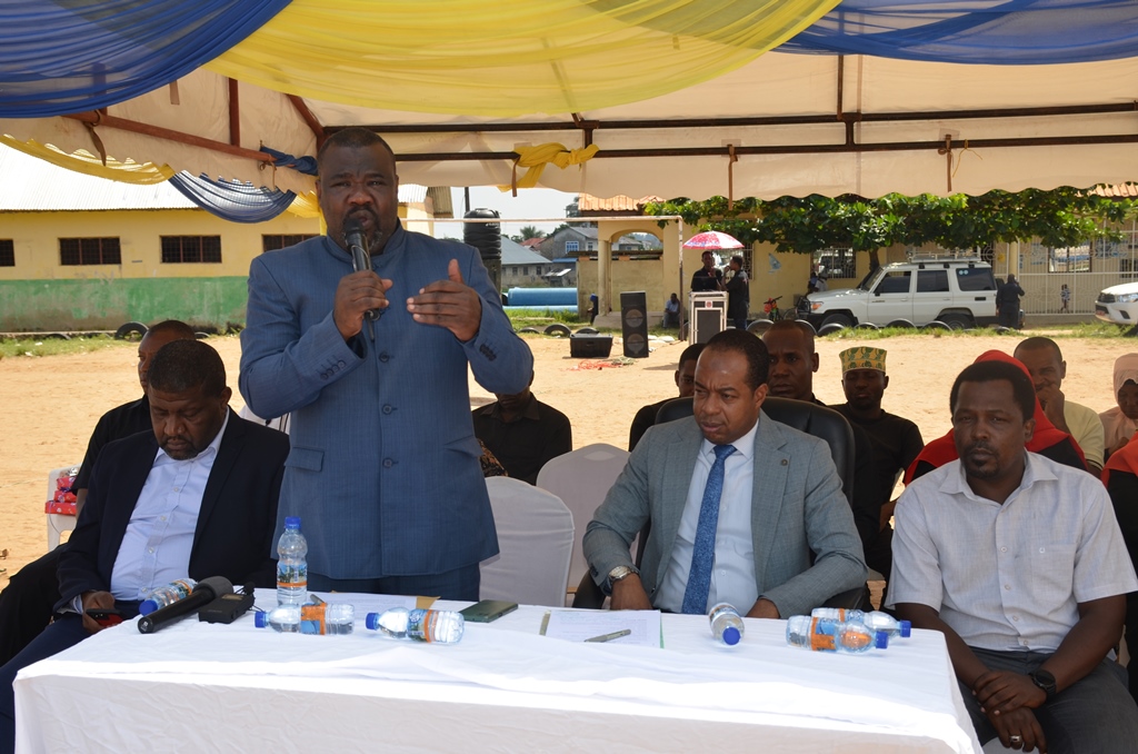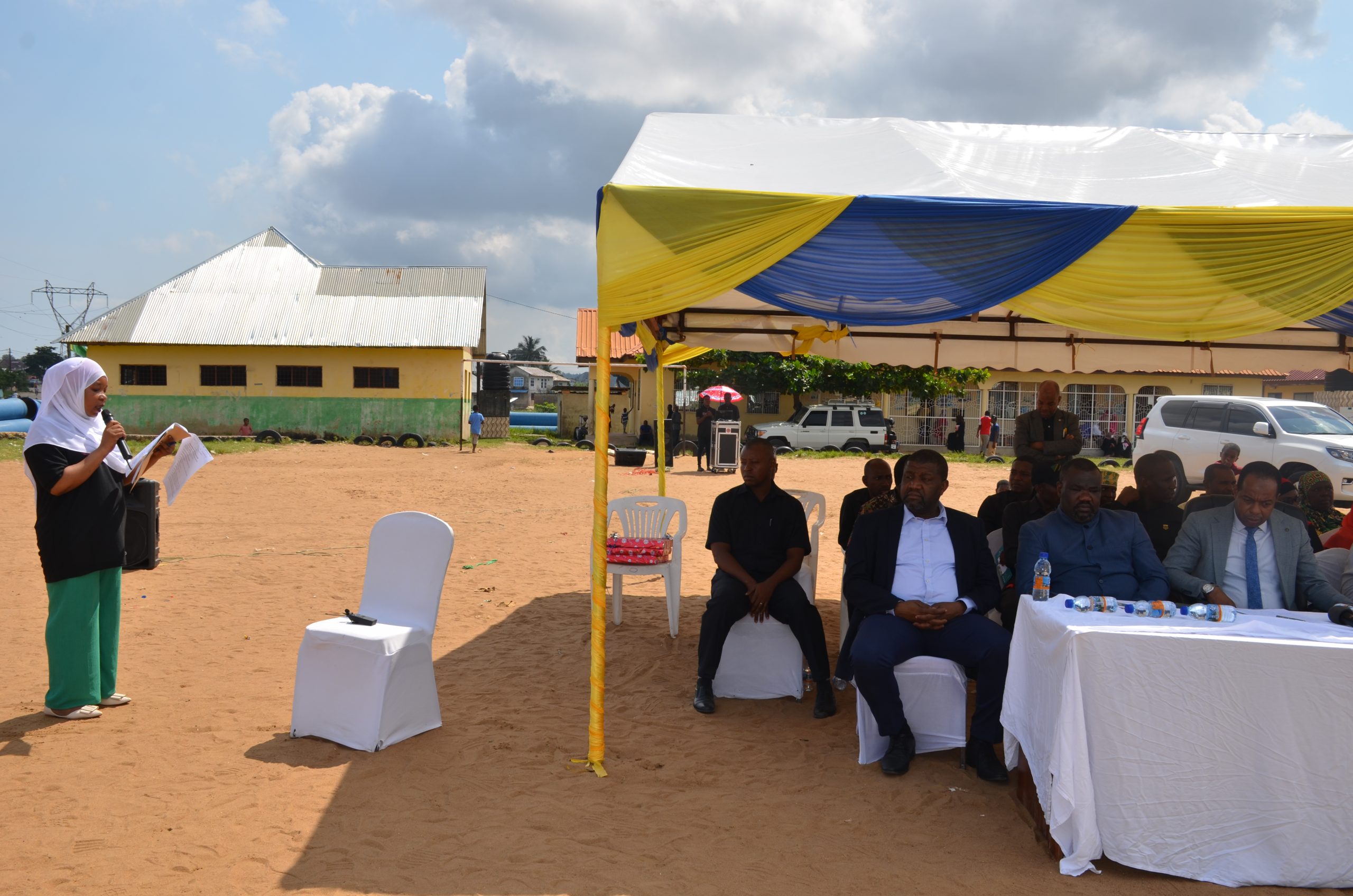 Naibu Waziri wa Afya Zanzibar Hassan Hafidh Khamis akizunguza machache na kumkaribisha mgeni rasmi Waziri wa Nchi (AR) Tawala za Mikoa Serikali za Mitaaa na Idara maalum za SMZ Masoud Ali Mohammed kuzindua zoezi la uchangiaji damu katika maadhimisho ya siku ya wachangiaji damu ambayo kitaifa huadhimishwa kila ifikapo juni 14,hafla iliyofanyika juni 15,2023 huko uwanja wa Magirisi Wilaya ya Magharib B Mkoa wa Mjini Magharibi juni 15,2023.