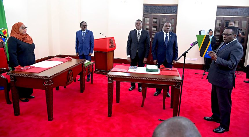 Rais wa Jamhuri ya Muungano wa Tanzania Mhe. Samia Suluhu Hassan akimuapisha Eng. Rogatus Hussein Mativila kuwa Naibu Katibu Mkuu Ofisi ya Rais, TAMISEMI (Miundombinu) kwenye hafla fupi iliyofanyika Ikulu Chamwino Mkoani Dodoma