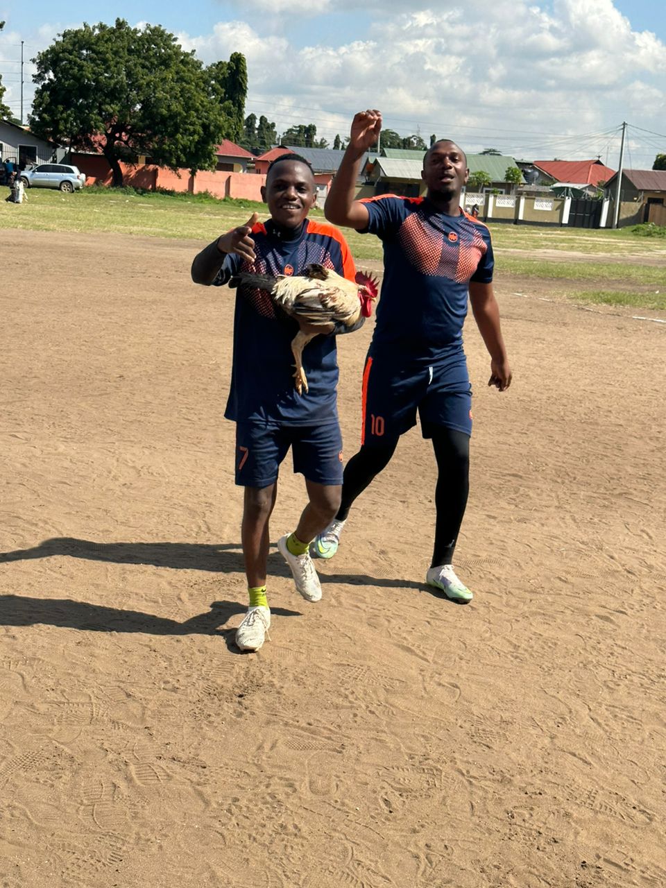 Mshindi wa kukimbiza kuku Bw. Daudi Mhehe akiwa ameshika kuku aliyeshinda wakati wa Bonanza la Michezo.