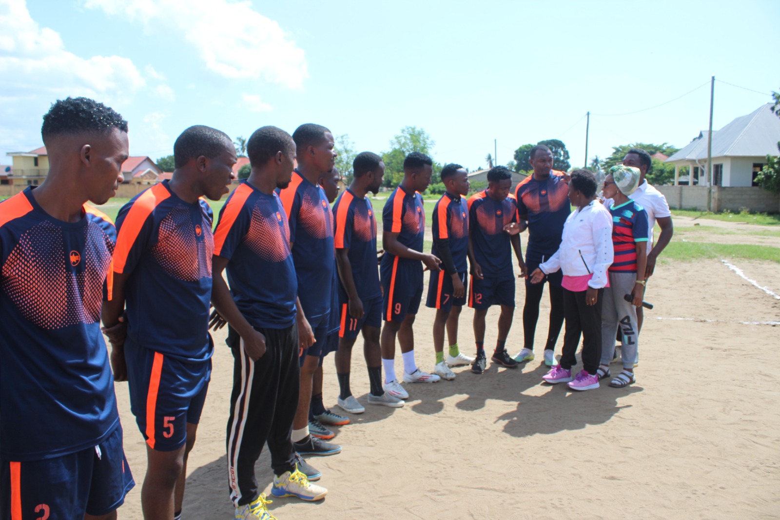 Kaimu Rasi wa Ndaki ya Dar es Salaam, Chuo Kikuu Mzumbe Dkt. Coretha Komba akiwaasa wachezaji wa timu zote mbili kucheza mchezo wenye amani na upendo.
