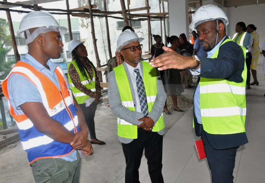 Mkurugenzi Mtendaji wa Taasisi ya Moyo Jakaya Kikwete (JKCI) Dkt. Peter Kisenge akimuelezea Katibu Mkuu Wizara ya Afya Dkt. Seif Shekalaghe maendeleo ya ujenzi wa jengo la Utawala na vipimo alipotembelea jengo hilo leo kwa ajili ya kuangalia maendeleo ya ujenzi.