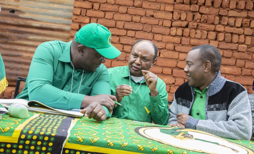 Katibu Mkuu wa Chama Cha Mapinduzi Ndugu Daniel Chongolo akimsikiliza Mwenyekiti wa CCM Mkoa wa Dodoma Alhaji Adam Kimbisa (katikati), akifafanua mila ya kiheshima ya shanga nyeupe wakati wa kumkaribisha Kiongozi mkubwa mara baada ya kuwasili kwenye kikao cha shina namba 6, tawi la Bwawani, kata ya Itaswi wilayani Kondoa, kulia ni MNEC wa mkoa wa Dodoma Ndugu Donald Mejeti.