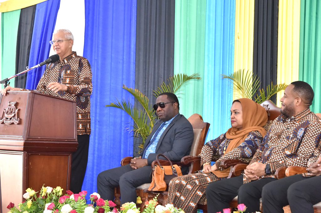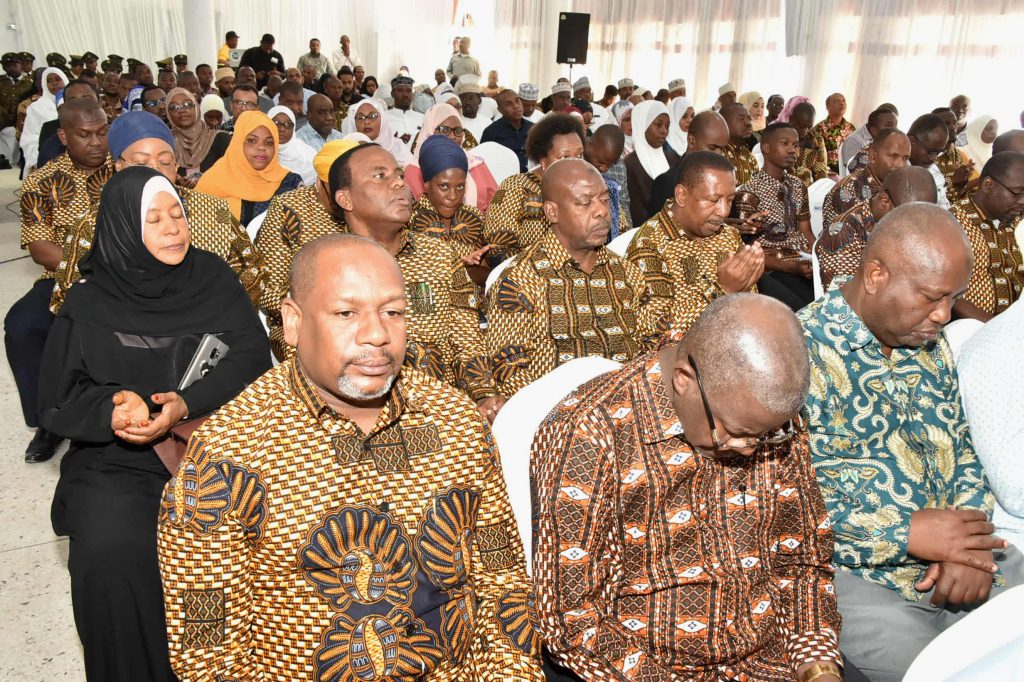 Waziri wa Nchi Ofisi ya Rais Utumishi na Utawala Bora Mhe.Haroun Ali Suleiman alipokuwa akimkaribisha Rais wa Zanzibar na Mwenyekiti wa Baraza la Mapinduzi Dk.Hussein Ali Mwinyi (hayupo pichani) ili azungumze na Viongozi na Wafayakazi mbali mbali katika Kilee cha Maadhimisho ya Wiki ya Utumishi wa Umma Zanzibar yaliyofanyika leo katika ukumbi wa Idrisa Abdulwakil Kikwajuni Jijini Zanzibar,(kulia) Spika wa Baraza la Wawakilishi Zanzibar Mhe.Zubeir Ali Maulid, Mke wa Rais Mhe.Mama Mariam Mwinyi na Mkuu wa Mkoa wa Mjini Magharibi Mhe.Idrisa Kitwana Mustafa.