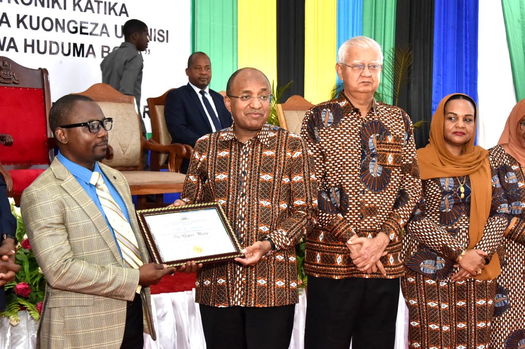 Rais wa Zanzibar na Mwenyekiti wa Baraza la Mapinduzi Dk.Hussein Ali Mwinyi (katikati) akimkabidhi cheti Ndg John Kangano Mwisango (kushoto) kutoka Engo Kampany katika hafla ya Kilee cha Maadhimisho ya Wiki ya Utumishi wa Umma Zanzibar yaliyofanyika leo katika ukumbi wa Idrisa Abdulwakil Kikwajuni Jijini Zanzibar(kulia) Mke wa Rais Mhe.Mama Mariam Mwinyi na Waziri wa Nchi Ofisi ya Rais Utumishi na Utawala Bora Mhe.Haroun Ali Suleiman.