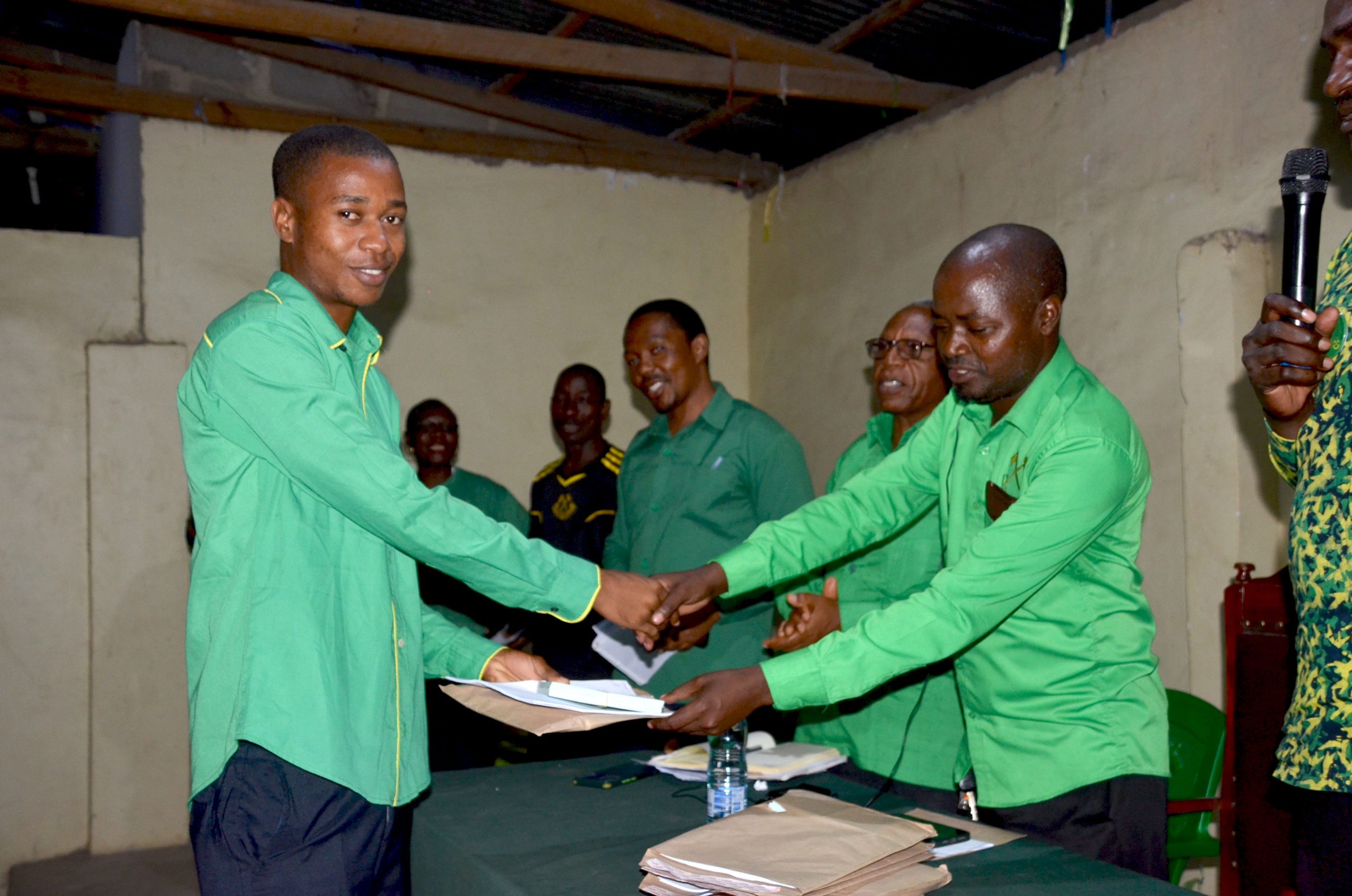 Mwenyekiti wa Jumuiya ya Wazazi Wilaya ya Ilala Mhe. Mohamed Msofe (kulia) akimkabidhi kadi na kitini Cha mafunzo ya uongozi kwa viongozi wa Matawi Kata ya Kitunda.