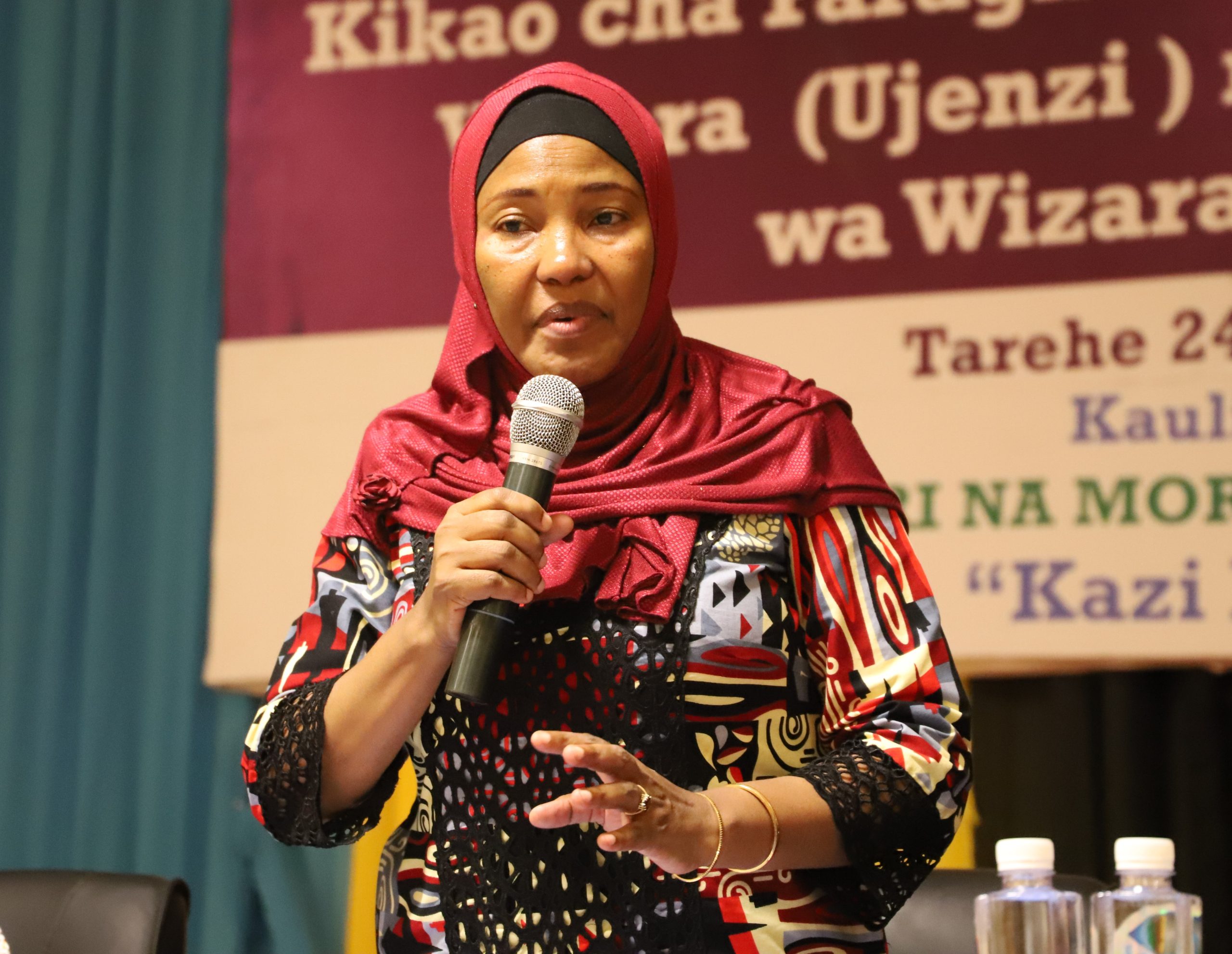 Katibu Mkuu wa Wizara ya Ujenzi na Uchukuzi (Sekta ya Ujenzi), Balozi Mhandisi Aisha Amour, akifafanua jambo kwa Menejimenti pamoja na watumishi wa sekta hiyo (hawapo pichani) katika kikao kazi, kilichofanyika Hombolo, jijini Dodoma.