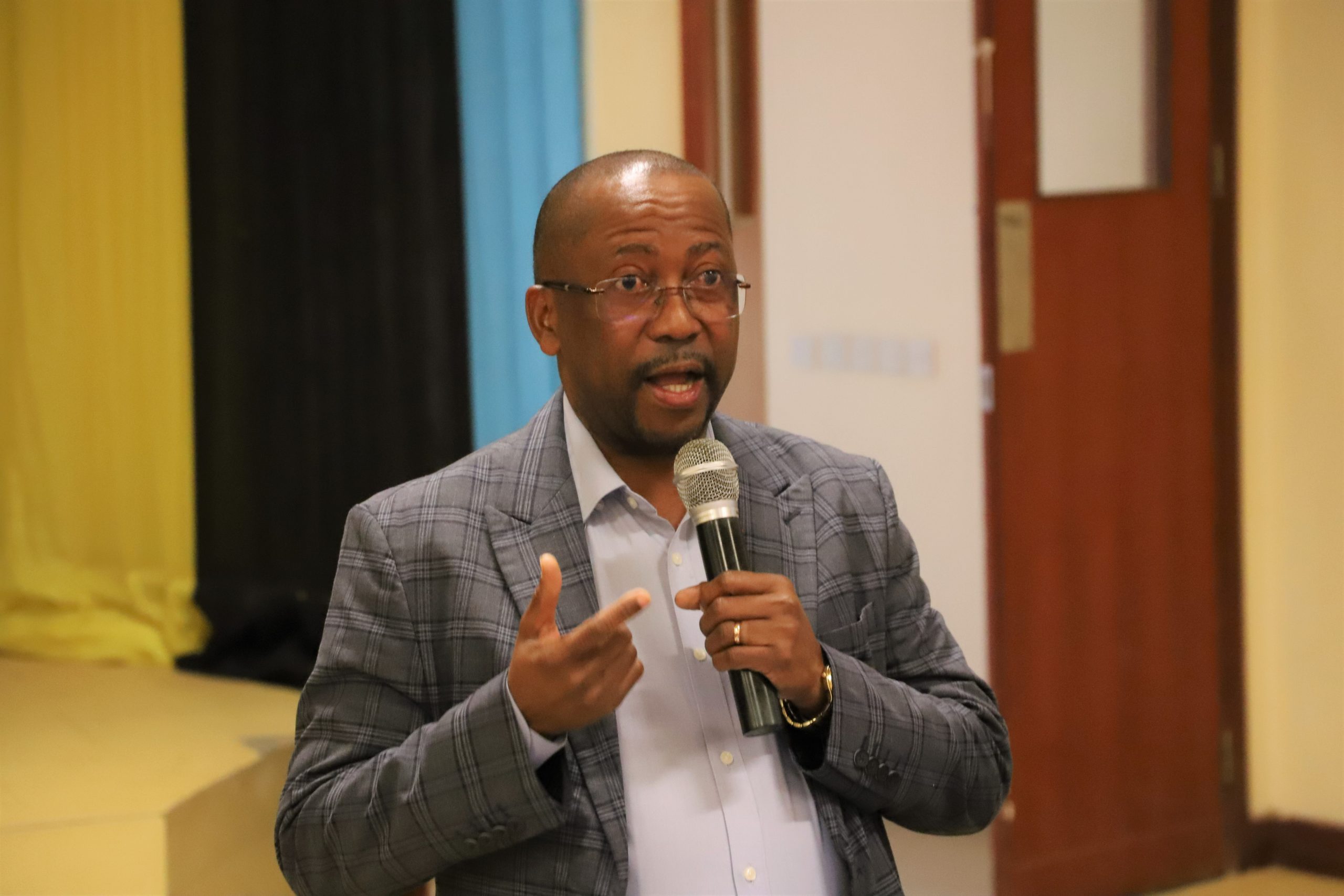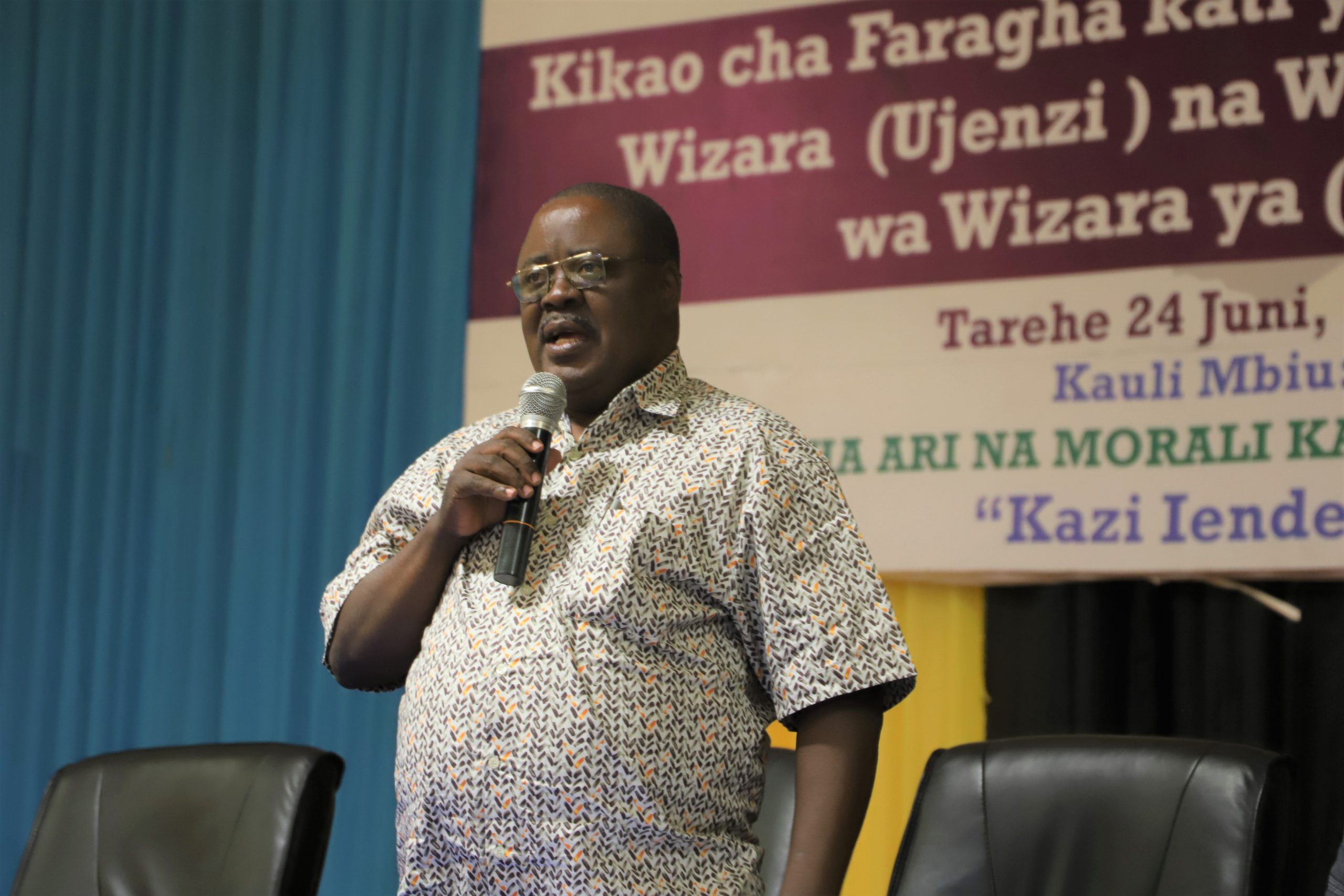 Naibu Katibu Mkuu Ofisi ya Rais Menejimenti ya Utumishi wa Umma na Utawala Bora, Bw Xavier Daud, akiwasilisha mada kuhusu kuimarisha ari na morali kwa watumishi wa umma katika kikao kazi kilichokutanisha Menejimenti ya Wizara ya Ujenzi na Uchukuzi (Sekta ya Ujenzi), pamoja na watumishi wa sekta hiyo (hawapo pichani) Hombolo, jijini Dodoma.
