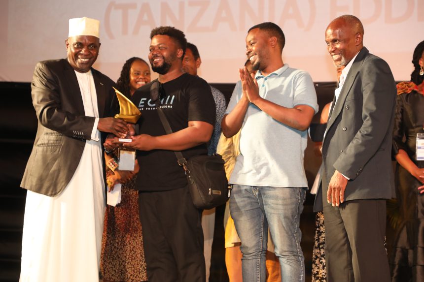 Waziri wa Nchi, Ofisi ya Makamu wa Pili wa Rais wa Zanzibar Mhe. Hamza Hassan Juma akikabidhi tuzo ya filamu bora na ndefu ya kisayansi (Sci-Fi) ya EONII wakati wa kufunga Tamasha la 26 la Kimataifa la Filamu la Zanzibar (ZIFF) Julai 02, 2023 mjini Zanzibar.