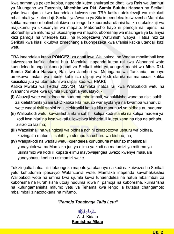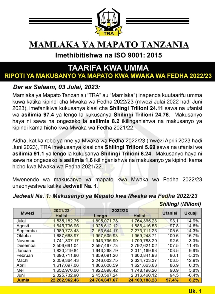 BiasharaTRA YATOA TAARIFA YA MAKUSANYO YA MAPATO MWAKA 2022-2023 Last updated: 2023/07/03 at 8:36 PM John Bukuku 2 years ago Share SHARE John Bukuku July 3, 2023 July 3, 2023 Share this Article Facebook Twitter Email Print Previous Article BENKI YA NMB YATOA MSAADA WA BATI 200 ZENYE THAMANI YA MIL 8.4 SEKONDARI YA IWAWA MAKETE MKOANI NJOMBE Next Article WAKALA WA USAJILI WA LESENI NA BIASHARA BRELA YAWAOMBA WANANCHI KUTEMBELEA BANDA LAO MAONESHO YA SABASABA