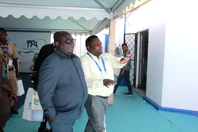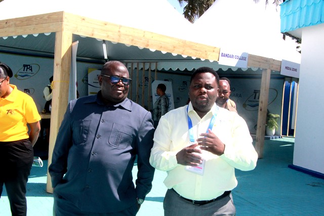 Naibu Waziri wa Wiara ya Ujenzi Mhandisi Godfery Kasekenywa akipata maelezo kutoka kwa Meneja wa Mawasiliano Mamlaka ya Bandari Tanzania TPA wakati alipotembelea banda la Mamlaka hiyo katika Maonesho ya 47 ya Biashara ya Kimataifa yanayoendelea kwenye viwanja vya Sabasaba jijiniDar es Salaam.