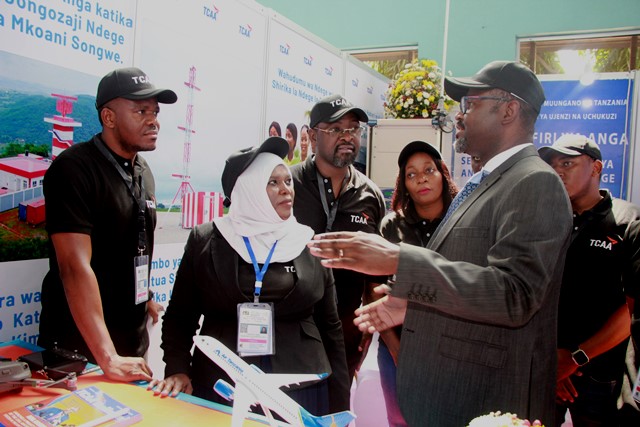 Hamza Johari Mkurugenzi Mkuu wa Mamlaka ya Usafiri wa Anga (TCAA) akielekeza jambo kwa wafanyakazi wa shirika hilo kwenye Maonesho ya 47 ya Biashara ya Kimataifa Sabasaba yanayoendelea jijini Dar es Salaam kuhusu uhaba wa marubani nchini.