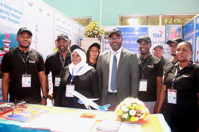 Hamza Johari Mkurugenzi Mkuu wa Mamlaka ya Usafiri wa Anga (TCAA) akiwa katika picha ya pamoja na wafanyakazi wa shirika hilo kwenye Maonesho ya 47 ya Biashara ya Kimataifa Sabasaba yanayoendelea jijini Dar es Salaam kuhusu uhaba wa marubani nchini.