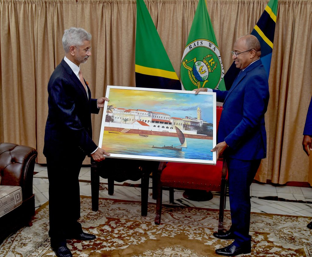 RAIS wa Zanzibar na Mwenyekiti wa Baraza la Mapinduzi Mhe.Dk.Hussein Ali Mwinyi akimkabidhi zawadi ya picha maalum ya mandhari ya Mji wa Zanzibar, mgeni wake Waziri wa Mambo ya Nje wa India Mhe. Subrahamanyam Jaishankar, baada ya kumaliza mazungumzo yao yaliofanyika katika ukumbi wa Ikulu Jijini Zanzibar, 5-7-2023, kabla ya kuaza kwa hafla ya utiaji wa saini ya uazishwaji wa Tawi la Chuo Kikuu cha Teknologia cha “India Institutes of Technology (IIT)” hafla hiyo iliyofanyika katika ukumbi wa Ikulu Zanzibar.