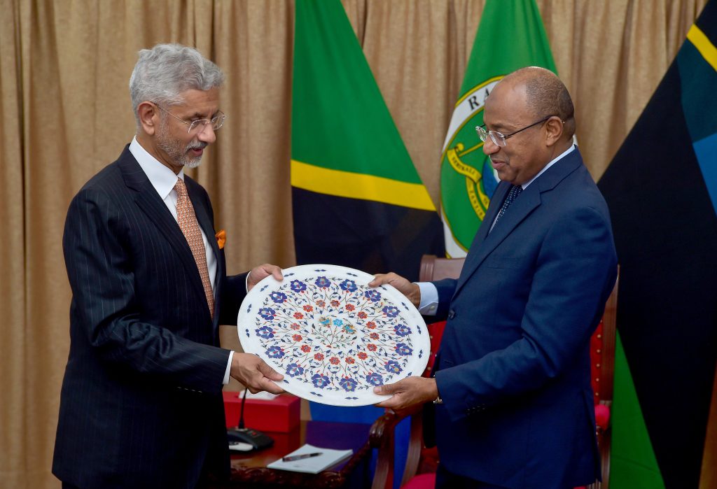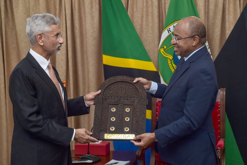 RAIS wa Zanzibar na Mwenyekiti wa Baraza la Mapinduzi Mhe.Dk.Hussein Ali Mwinyi akikabidhiwa zawadi maalum na mgeni wake Waziri wa Mambo ya Nje wa India Mhe. Subrahamanyam Jaishankar, baada ya kumaliza mazungumzo yao yaliofanyika katika ukumbi wa Ikulu Jijini Zanzibar, 5-7-2023, kabla ya kuaza kwa hafla ya utiaji wa saini ya uazishwaji wa Tawi la Chuo Kikuu cha Teknologia cha “India Institutes of Technology (IIT)” hafla hiyo iliyofanyika katika ukumbi wa Ikulu Zanzibar.