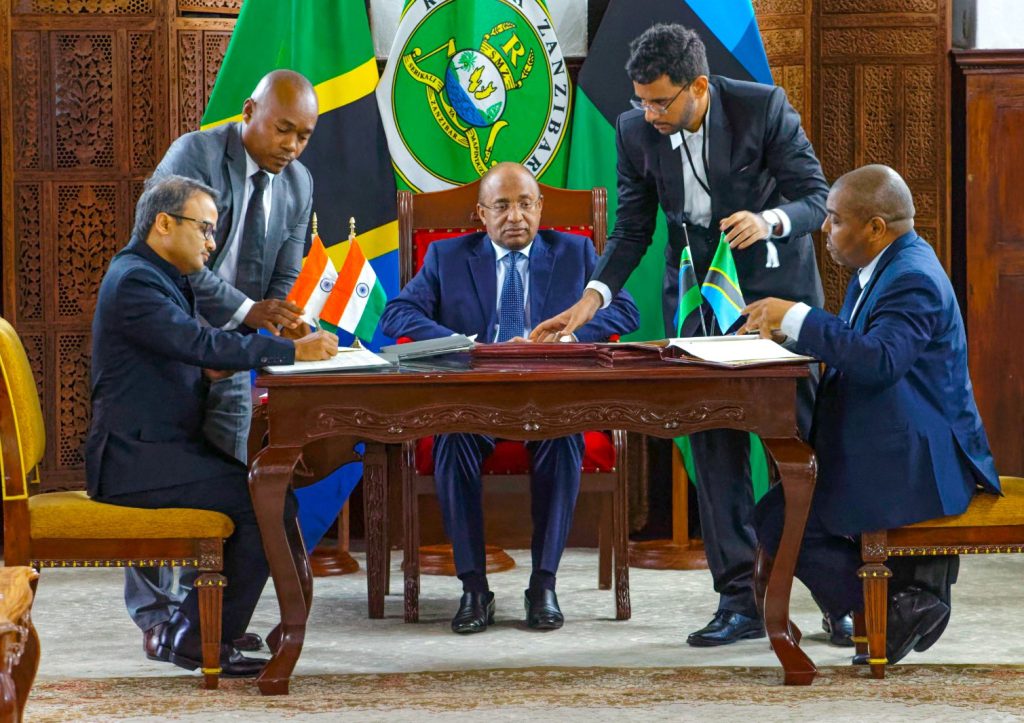 RAIS wa Zanzibar na Mwenyekiti wa Baraza la Mapinduzi Mhe.Dk.Hussein Ali Mwinyi akishuhudia utiaji wa saini ya uazishwaji kwa Tawi la Chuo Kikuu cha Teknologia cha India (IIT) Kampasi ya Zanzibar, akisaini kwa upande wa Serikali ya India Balozi wa India Nchini Tanzania Mhe.Binaya Pradhan (kulia kwa Rais) na kwa upande wa Serikali wa Mapinduzi Zanzibar amesaini Kaimu Katibu Mkuu wa Mkuu Wizara ya Elimu na Mafunzo ya Amali Zanzibar,Mkurugenzi Mipango,Sera na Utafiti (WEMA)Ndg.Khalid Masoud Waziri.(kushoto kwa Rais) hafla hiyo ya utiaji wa saini iliyofanyika katika ukumbi wa Ikulu Jijini Zanzibar.