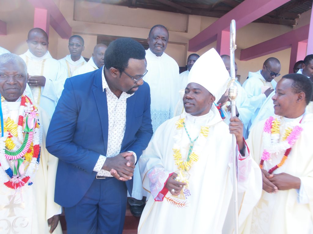 Mkuu wa wilaya ya Tunduru Wakili Julius Mtatiro akiteta jambo na Mhashamu Askofu wa Kanisa Katoriki Jimbo la Tunduru-Masasi Filbert Mhasi baada ya kumalizika kwa sherehe ya Jubilei ya miaka 25 na 40 ya mapadri wanne wa Jimbo hilo.