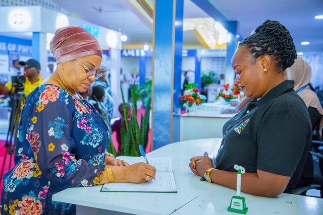 Katibu Mkuu Wizara ya Fedha, Dkt. Natu El-maamry Mwamba akisaini kitabu cha wageni katika banda la Wizara ya Fedha kwenye Maonesho ya 47 ya Biashara ya Kimataifa ya Dar es Salaam, yanayoendelea katika viwanja vya sabasaba, Barabara ya Kilwa, jijini humo. Kulia ni Katibu Muhtasi wa Wizara hiyo, Bi. Masia Msuya.