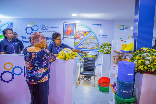 Katibu Mkuu Wizara ya Fedha, Dkt. Natu El-maamry Mwamba akisikiliza maelezo kuhusu wanufaika wa mikopo inayotolewa na Benki ya Maendeleo TIB, kutoka kwa Meneja wa Fedha za Uwakala wa banki hiyo, Bi. Monica Luziro, alipotembelea banda la Wizara ya Fedha katika Maonesho ya 47 ya Biashara ya Kimataifa ya Dar es Salaam, yanayoendelea katika viwanja vya sabasaba, Barabara ya Kilwa, jijini humo.