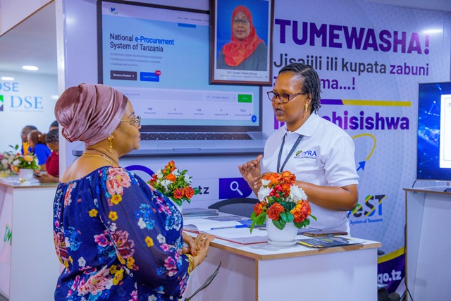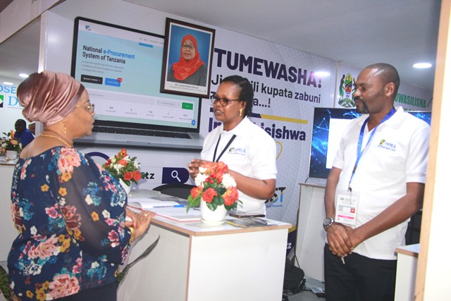 Katibu Mkuu Wizara ya Fedha, Dkt. Natu El-maamry Mwamba akisikiliza maelezo kuhusu mfumo mpya wa ununuzi wa umma kutoka kwa Mkuu wa Kitengo cha Habari wa Taasisi ya Usimamizi ya Ununuzi wa Umma (PPRA), Bi. Zawadi Msala, alipotembelea banda la Wizara ya Fedha katika Maonesho ya 47 ya Biashara ya Kimataifa ya Dar es Salaam, yanayoendelea katika viwanja vya sabasaba, Barabara ya Kilwa, jijini humo.