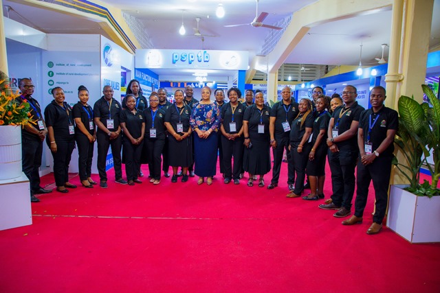 Katibu Mkuu Wizara ya Fedha, Dkt. Natu El-maamry Mwamba akiwa katika picha ya pamoja na watumishi wa Wizara hiyo walioshirikili katika Maonesho ya 47 ya Biashara ya Kimataifa ya Dar es Salaam, yanayoendelea katika viwanja vya sabasaba, Barabara ya Kilwa, jijini humo, alipotembelea banda la Wizara hiyo.