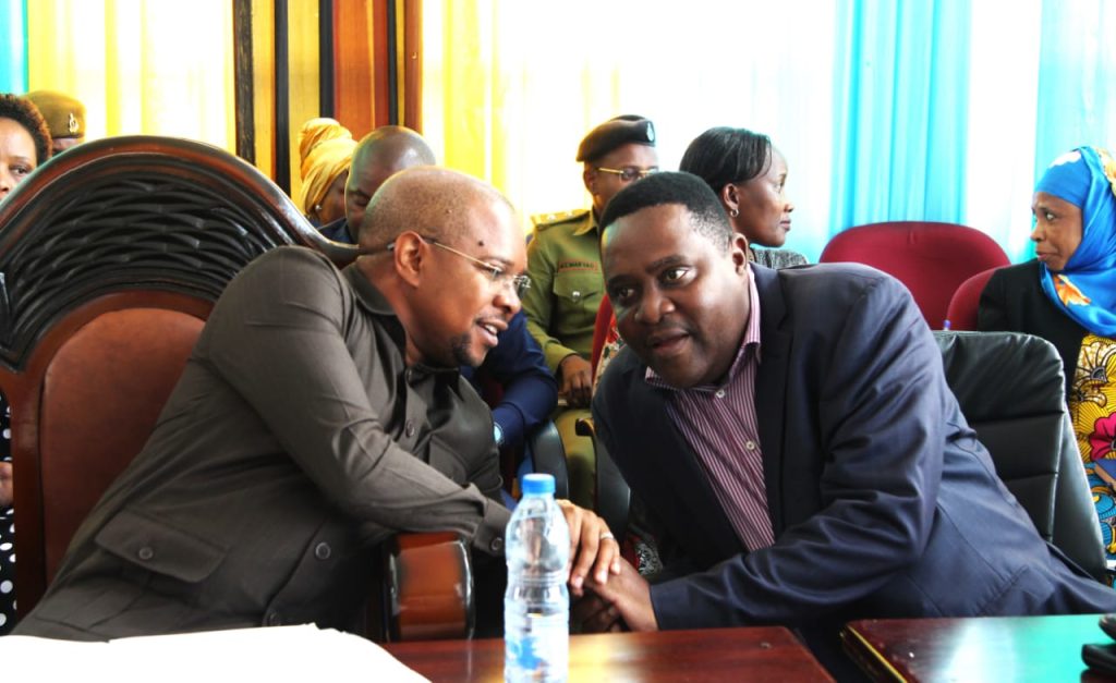 Naibu Waziri, Ofisi ya Rais, Menejimenti ya Utumishi wa Umma na Utawala Bora, Mhe. Ridhiwani Kikwete (kushoto) akiteta jambo na Mkuu wa Mkoa wa Pwani, Mhe. Abubakar Kunenge (kulia) wakati wa ziara ya kikazi ya Naibu Waziri Kikwete iliyolenga kuhimiza uwajibikaji na kutatua changamoto zinazowakabili katika halmashauri hiyo.