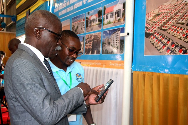 Mtendaji Mkuu wa TBA Arch. Daud Kondoro akimuonesha kitu kwenye simu yake Fredrick Kalinga Kaimu Meneja wa Mawasiiano na Masoko wakati alipotembelea katika banda la TBA kwenye maonesho ya 47 ya Niashara ya Kimataifa yanayofanyika kwenye viwanja vya Sabasaba Barabara ya Kilwa jijini