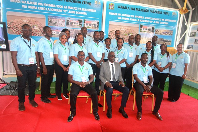 Mtendaji Mkuu wa TBA Arch. Daud Kondoro akiwa katika picha ya pamoja na wafanyakazi wa TBA mara baada ya kutembela banda hilo.