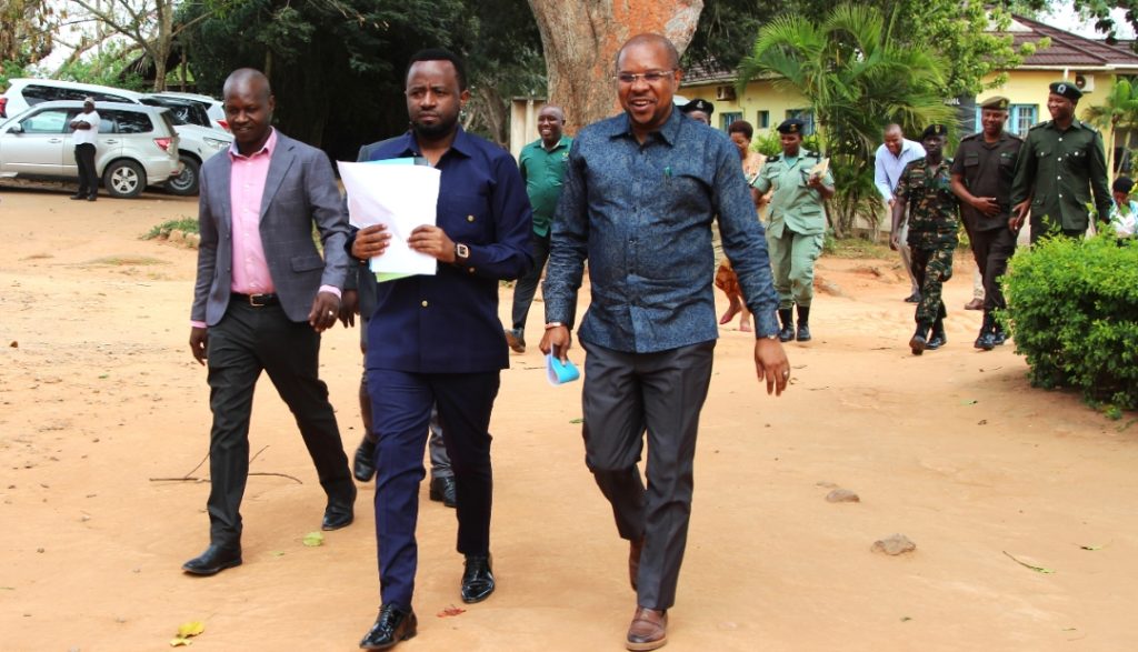 Naibu Waziri, Ofisi ya Rais, Menejimenti ya Utumishi wa Umma na Utawala Bora, Mhe. Ridhiwani Kikwete (Wa kwanza kulia) akielekea kwenye ukumbi wa mikutano Mkoa wa Pwani katika Halmashauri ya Wilaya ya Kisarawe kwa lengo la kuzungumza na watumishi wa halmashauri hiyo wakati wa ziara yake ya kikazi iliyolenga kuhimiza uwajibikaji na kutatua changamoto zinazowakabili watumishi hao. Katikati ni Mwakilishi wa Mkuu wa Wilaya ya Kisarawe ambaye pia ni Mkuu wa Wilaya ya Kibaha, Mhe. Nickson Simon.