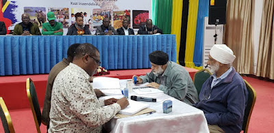 Wakandarasi wanaotekeleza miradi hiyo wakisaini mkataba kati yao na Wakala wa maji na usafi wa mazingira vijijini (Ruwasa)katika ofisi ya mkuu wa mkoa wa Arusha.