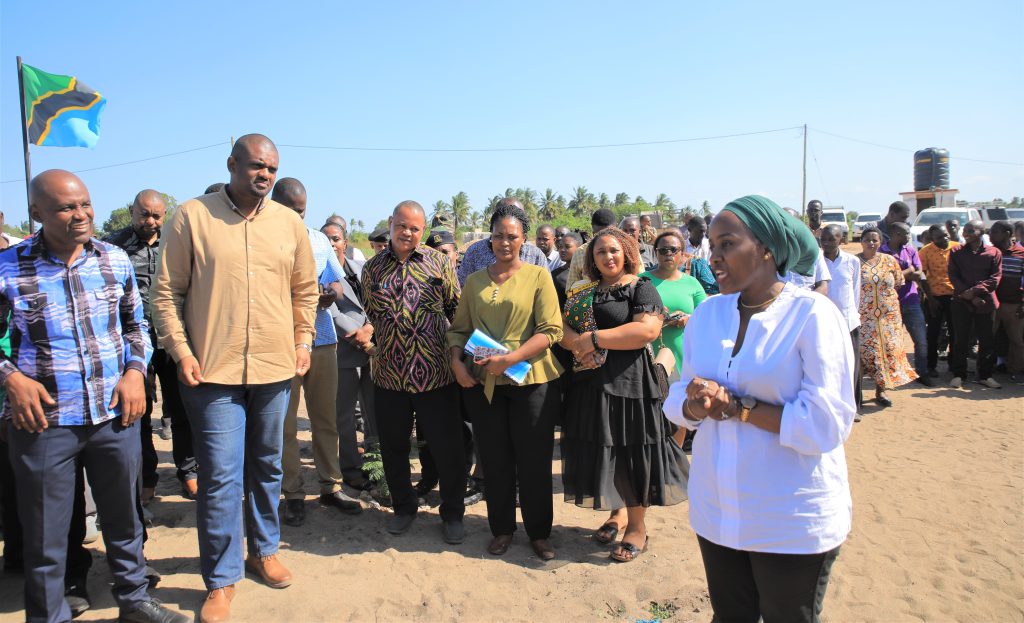 Mkuu wa Wilaya ya Kigamboni Mhe. Halima Bulembo akitoa neno la utangulizi kabla ya kumkaribisha Naibu Waziri, Ofisi ya Rais-TAMISEMI Mhe. Deogratius Ndejembi kuzungumza na wananchi wa Tundwi Songani na viongozi wa Halmashauri ya Manispaa ya Kigamboni, wakati wa ziara ya Mhe. Ndejembi ya kukagua ujenzi wa shule mpya ya Sekondari Tundwi Songani inayojengwa kupitia mradi wa SEQUIP