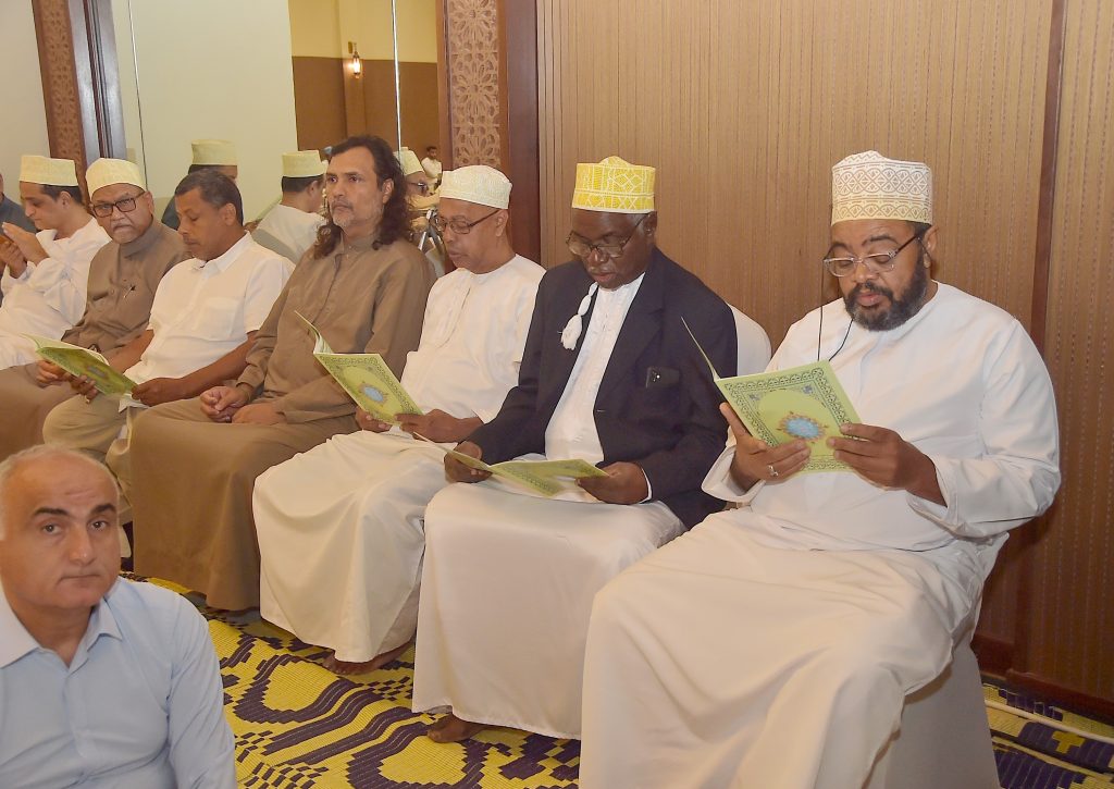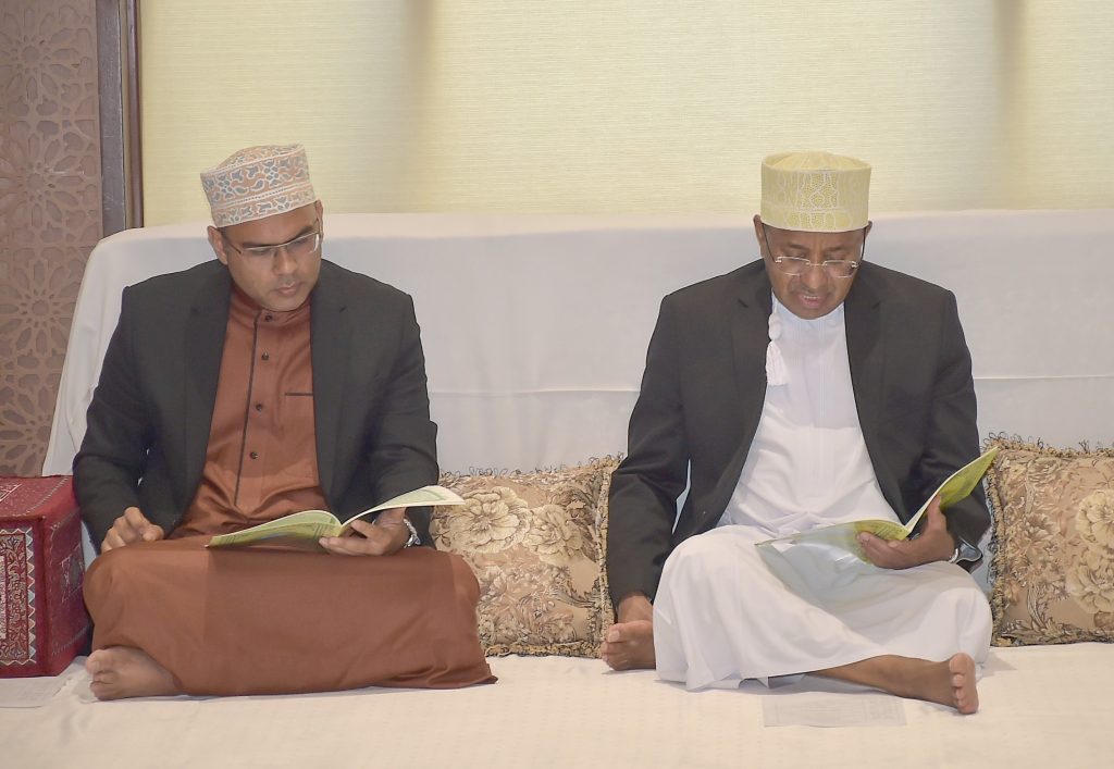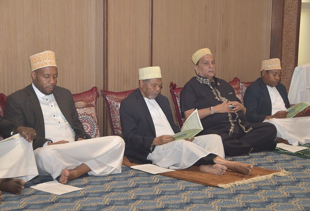 RAIS Mstaafu wa Zanzibar Alhajj Dk.Ali Mohamed Shein akishiriki katika kisomo cha hitma na dua ya kumuombea Marehemu Mohammed Hassanali Raza,kilichofanyika katika ukumbi wa hoteli ya Golden Tulip Uwanja wa Ndege Kiembesamaki Wilaya ya Magharibi “B” Unguja Jijini Zanzibar na (kulia kwake) Spika wa Baraza la Wawakilishi Zanzibar Mhe. Zuberi Ali Maulid (kushoto kwake) Muhusin Hassanali na Makamu wa Kwanza wa Rais wa Zanzibar Alhajj Othman Masoud Othman.(Picha na Ikulu)