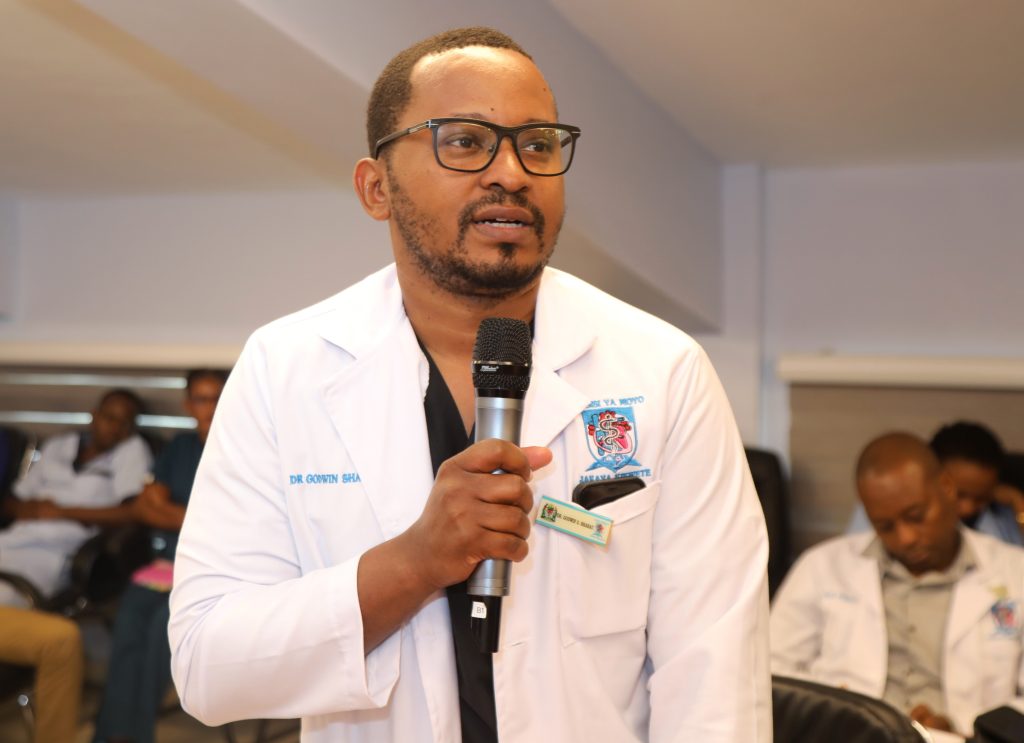 Daktari bingwa wa upasuaji wa moyo kwa watoto wa Taasisi ya Moyo Jakaya Kikwete (JKCI) Godwin Sharau akichangia mada wakati wa mafunzo ya siku mbili ya kuwahudumia wagonjwa wa dharura na mahututi yanayofanyika katika Taasisi hiyo iliyopo jijini Dar es Salaam.