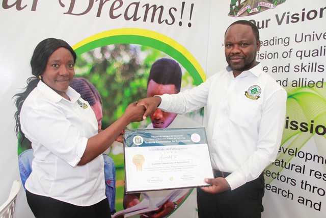 Mkuu wa Kitengo cha Elimu ya kujiendeleza Chuo Kikuu Cha Sokoine Cha Kilimo (SUA), Dkt. Emmanuel Malisa, akikabidhi cheti cha ushiriki wa maonesho hayo kwa Afisa Mawasiliano na Masoko wa Chuo Kikuu cha Sokoine SUA, Bi. Suzana Magobeko mara baada ya hafla ya ufungaji iliyofanyika kwenye viwanja vya Mnazi Mmoja jijini Dar es salaam Julia 22,2023.
