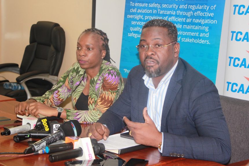 Meneja Mahusiano na Mawasiliano wa Mamlaka ya Usafiri wa Anga Tanzania (TCAA) Bw Yessaya Mwakifulefule akizungumza na waandishi wa habari katika makao makuu wa Mamlaka ya Usafiri wa Anga Tanzania TCAA kuhusu zoezi la utafutaji na uokoaji wa ndege uliofanyika leo Alhamisi Julai 27,2023 jijini Dar es Salaam, kushoto ni Mkurugenzi wa Huduma za Uongozaji Ndege TCAA Bi. Flora Mwanshinga.