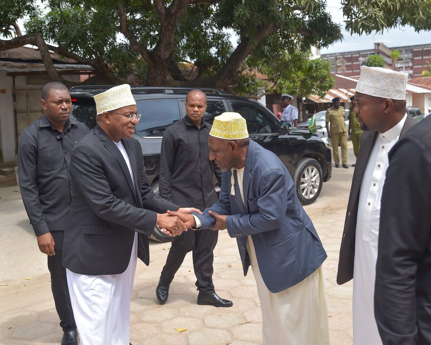 RAIS wa Zanzibar na Mwenyekiti wa Baraza la Mapinduzi Alhajj Dk.Hussein Ali Mwinyi akisalimiana na Naibu Mifti Mkuu wa Zanzibar Sheikh. Mahmoud Mussa Wadi alipowasili katika viwanja vya Msikiti wa Ijumaa Miembeni Wilaya ya Mjini Unguja Jijini Zanzibar kwa ajili ya kuhudhuria Ibada ya Sala ya Ijumaa iliyofanyika katika msikiti huo leo 28-7-2023.(Picha na Ikulu).