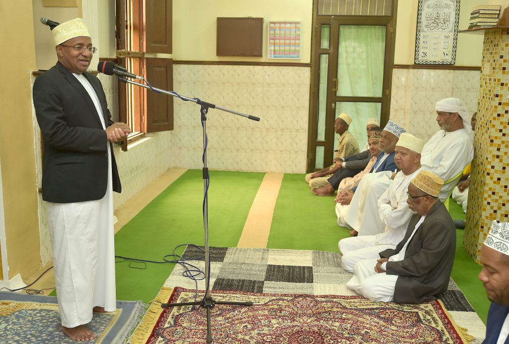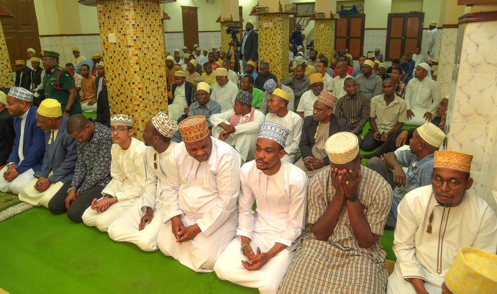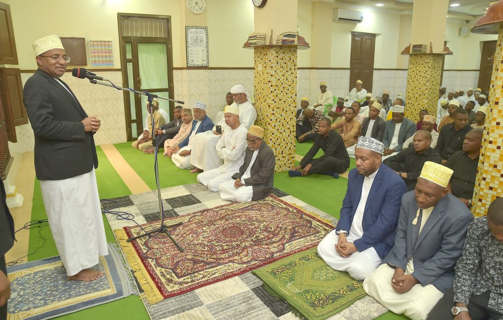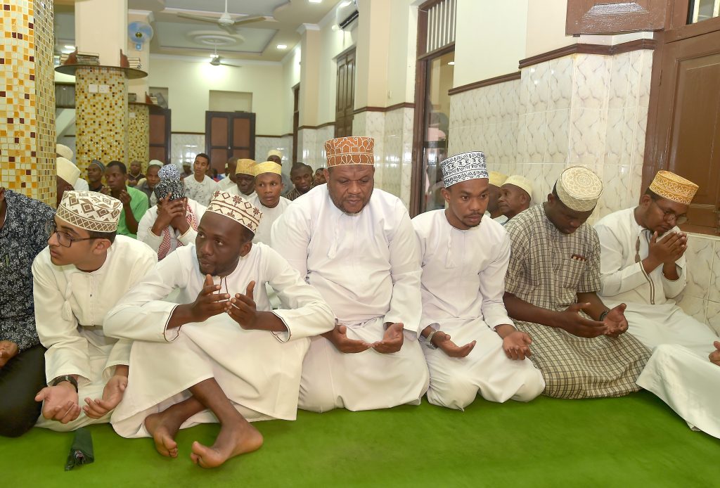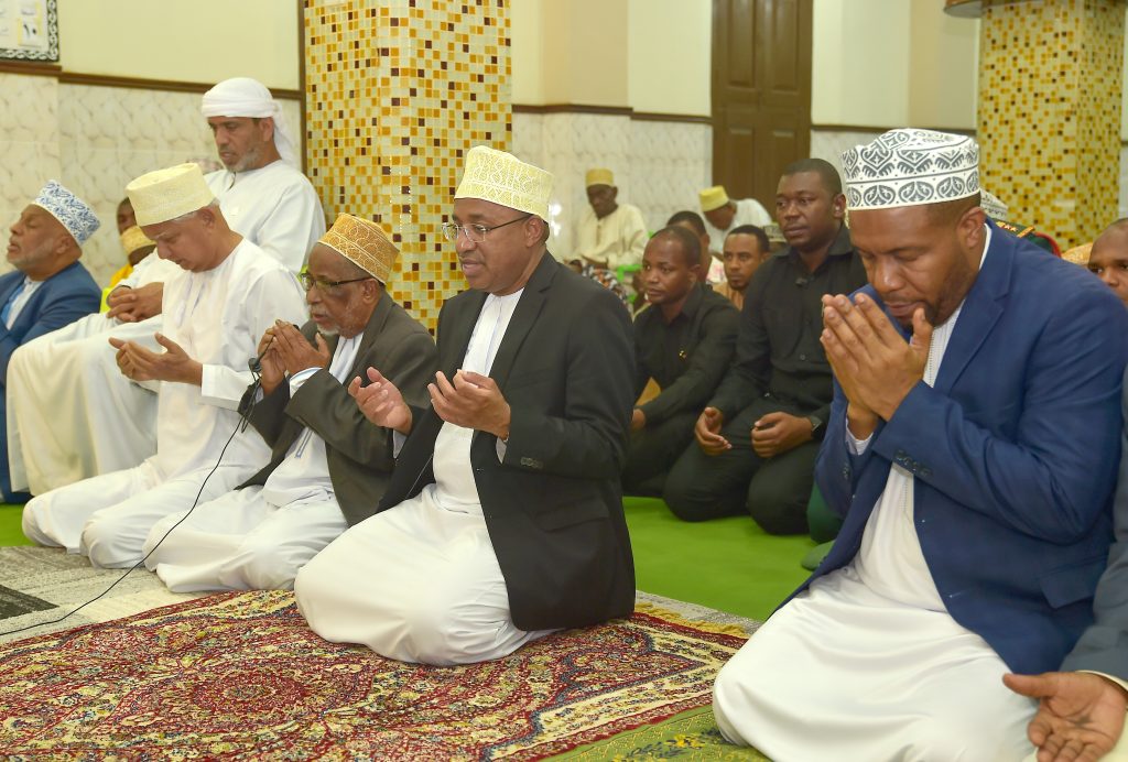 RAIS wa Zanzibar na Mwenyekiti wa Baraza la Mapinduzi Alhajj Dk.Hussein Ali Mwinyi akijumuina na Viongozi na Wananchi katika kuitikia dua ikisomwa na Mufti Mkuu wa Zanzibar Sheikh.Saleh Omar Kabi (kulia kwa Rais) na Waziri wa Nchi Ofisi ya Rais Katiba,Sheria,Utumishi na Utawala Bora Zanzibar Mhe.Haroun Ali Suleiman na (kushoto kwa Rais) Spika wa Baraza la Wawakilishi Zanzibar Mhe. Zuberi Ali Maulid.(Picha na Ikulu)