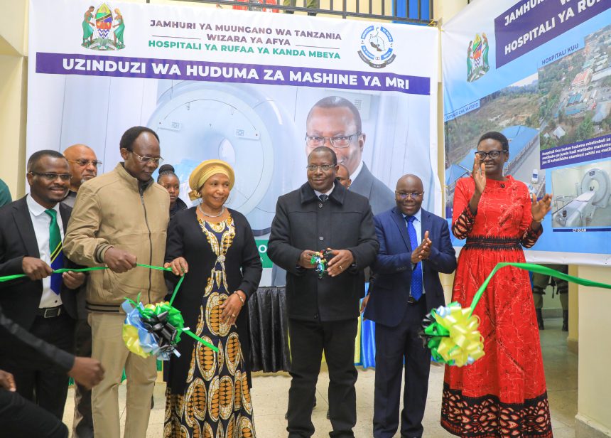 Makamu wa Rais wa Jamhuri ya Muungano wa Tanzania Mhe. Dkt. Philip Mpango akikata utepe kuashiria uzinduzi wa Huduma ya Mashine ya MRI katika Hospitali ya Rufaa ya Kanda Mbeya leo tarehe 01 Agosti 2023. (kutoka kulia ni Spik awa Bunge na Mbunge wa Jimbo la Mbeya Mjini Dkt. Tulia Ackson, Mkuu wa Mkoa wa Mbeya Juma Homera,Mke wa Makamu wa Rais Mama Mbonimpaye Mpango, Naibu Waziri wa Afya Dkt. Godwin Mollel na Mkurugenzi Mtendaji wa Hospitali ya Rufaa ya Kanda Mbeya Dkt. Godlove Mbwanji.