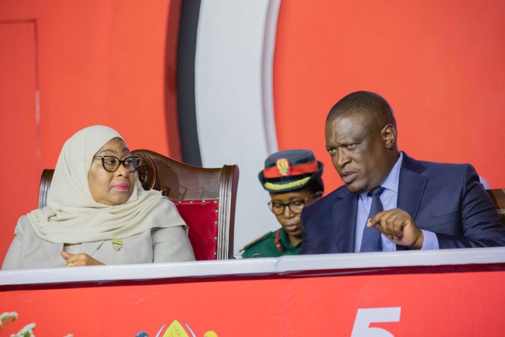 Rais wa Jamhuri ya Muungano wa Tanzania Mhe. Samia Suluhu Hassan akifurahia jambo na Waziri Mkuu Mhe. Kassim Majaliwa wakati wakimuangalia Msanii Mrisho Mpoto alipokuwa akitumbuiza kwenye kwenye hafla ya uzinduzi wa Kituo cha Mkongo wa Baharini cha Airtel 2Afrika pamoja na Mtandao wenye kasi ya 5G wa Kampuni ya Mawasiliano ya Airtel Tanzania iliyofanyika Mbezi Tanki Bovu Jijini Dar es Salaam tarehe 10 Agosti, 2023