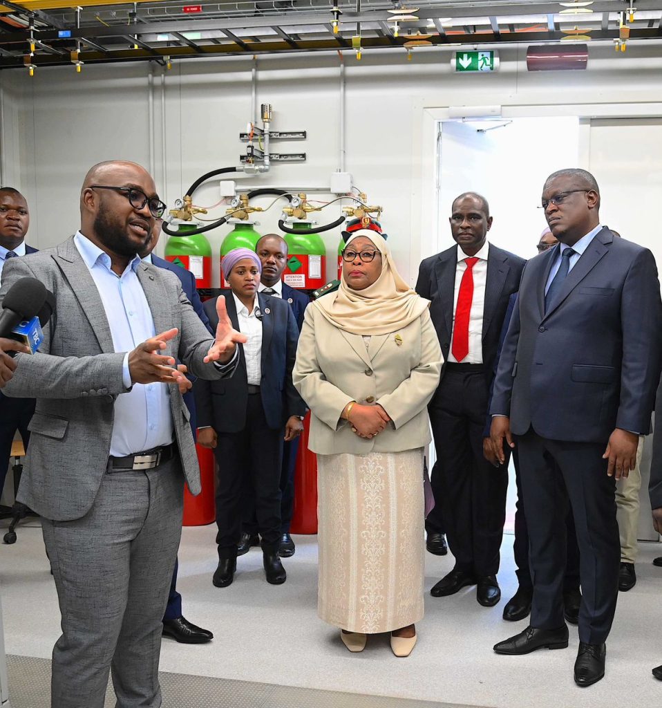 Rais wa Jamhuri ya Muungano wa Tanzania Mhe. Samia Suluhu Hassan akisikiliza maelezo kuhusu Kituo cha Mkongo wa Baharini cha Airtel 2Afrika kabla ya kukizindua rasmi kwenye hafla iliyofanyika Mbezi Tanki Bovu Jijini Dar es Salaam tarehe 10 Agosti, 2023.