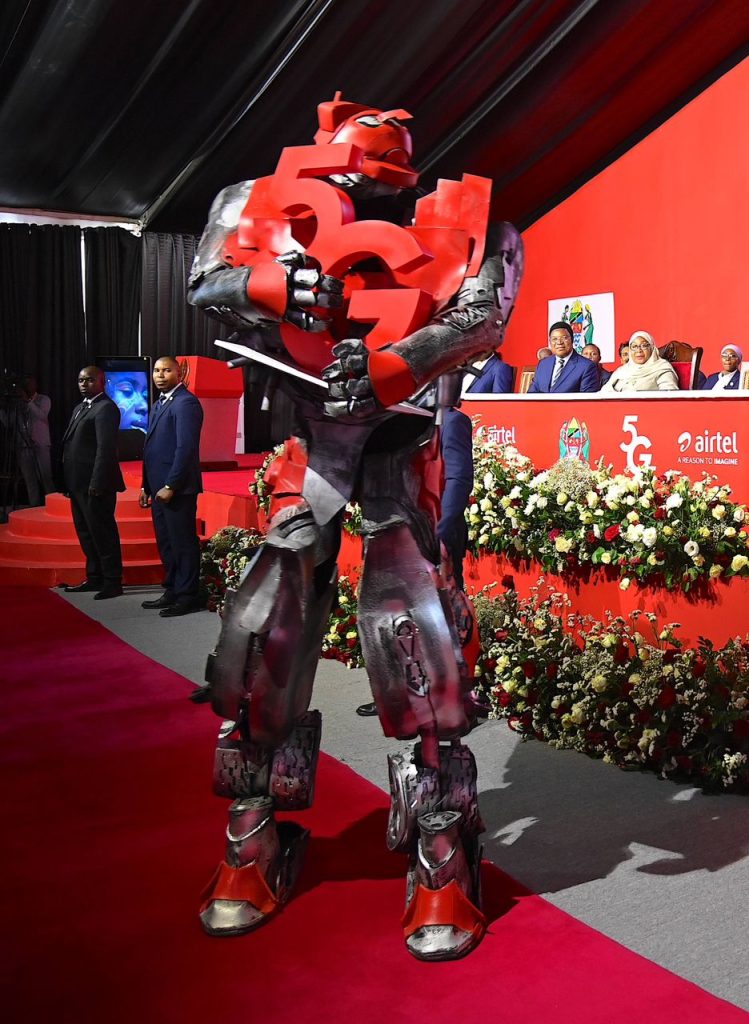 Roboti akiwa amebeba nembo ya 5G mara baada ya Rais wa Jamhuri ya Muungano wa Tanzania Mhe. Samia Suluhu Hassan kuzindua Mtandao wenye kasi ya 5G wa Kampuni ya Airtel Tanzania kwenye hafla iliyofanyika Mbezi Tanki Bovu Jijini Dar es Salaam tarehe 10 Agosti, 2023.