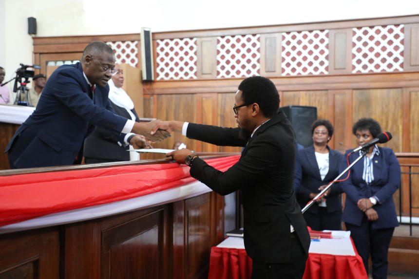 Jaji Mkuu wa Tanzania, Mhe. Prof. Ibrahim Hamis Juma (kushoto juu) akimkabidhi vitendea kazi ‘instruments’ mmoja wa Hakimu Mkazi mpya alieapishwa katika hafla ya uapisho ulifanyika tarehe 10 Agosti, 2023 Mahakama Kuu, jijini Dar es salaam.